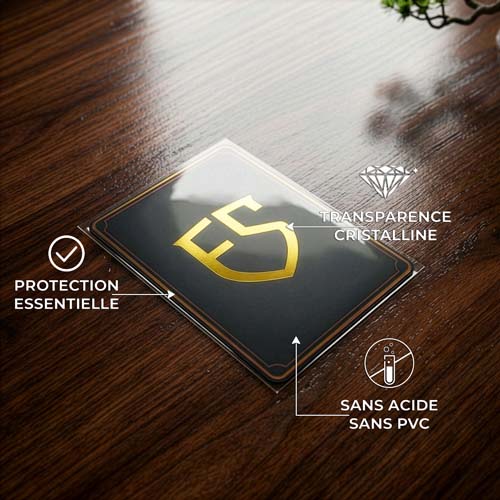 ✨ ULTRA HIGH CLARITY Nous avons poussé la transparence au maximum. Notre matériau offre une clarté cristalline exceptionnelle qui met en valeur les couleurs et les détails de vos cartes, même lorsqu’elles sont archivées.